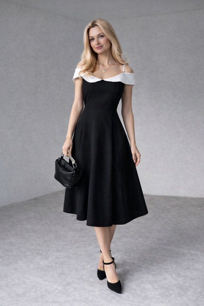 Siyah midi elbise, straplez ve ince askılı tasarımıyla klasik ve şık bir görünüm sunar. Parlak dokusu ve rahat kesimiyle ofis ortamına uygundur. ✨