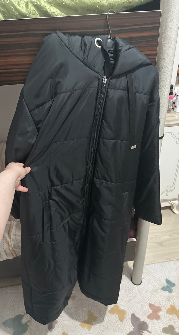 Siyah midi boy, fermuarlı, notched lapel yakalı, uzun kollu, bol kesim kadın kışlık mont. Sıcak tutan sentetik kumaştan üretilmiştir. ❄️