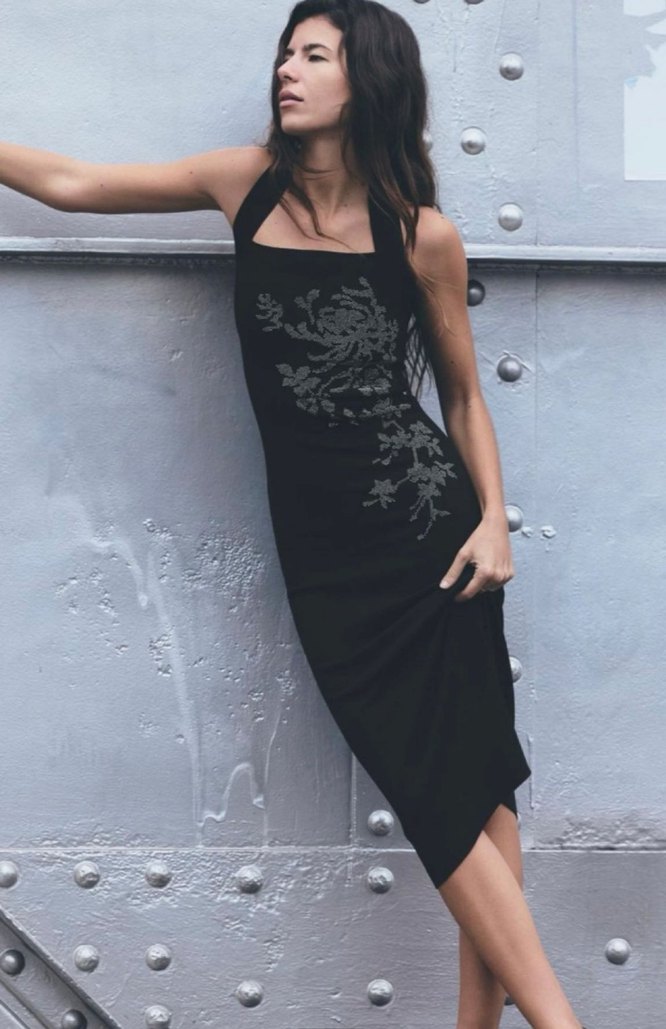 Siyah triki elbise, tas desenli ve triko kumaşla tasarlanmıştır. Romantik akşamlar için uygundur. iade yoktur