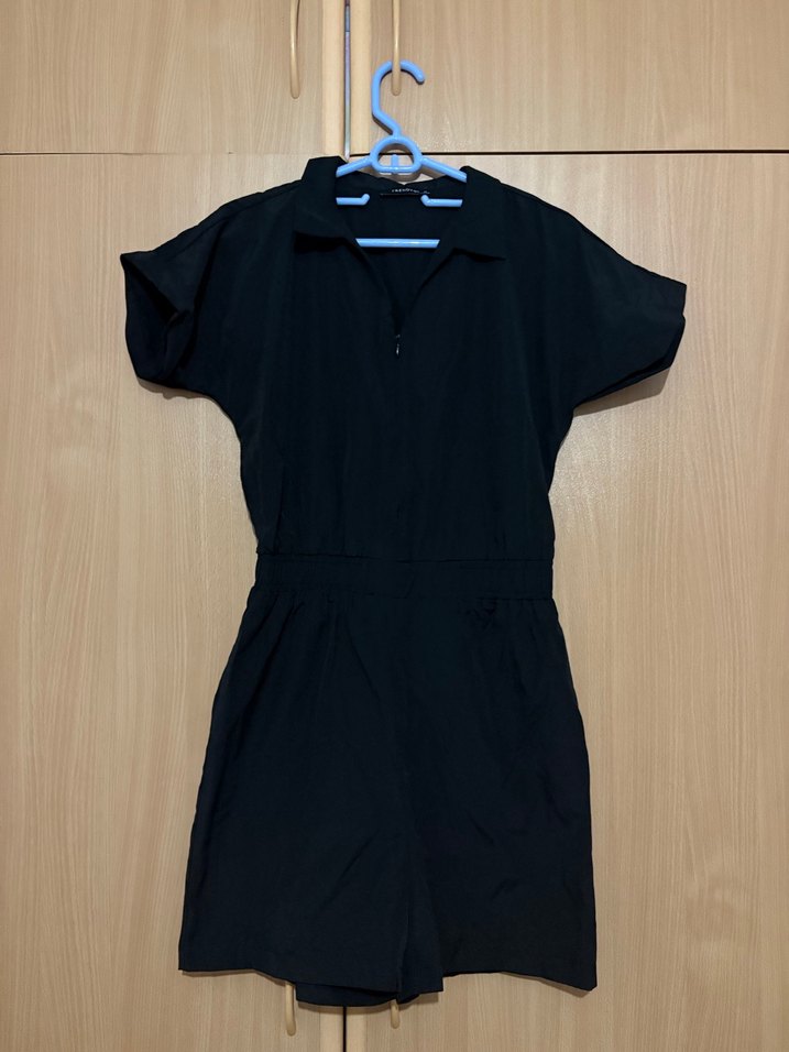 Siyah kemerli midi tulum, yakalı ve kısa kollu. Sentetik kumaştan, rahat ve şık bir görünüme sahip.