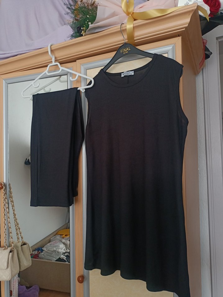 Siyah midi uzunlukta, kolsuz hamile tunik, salaş kesimli ve yuvarlak yakalı. İpeksi kumaştan, günlük kullanım için rahat ve şık.