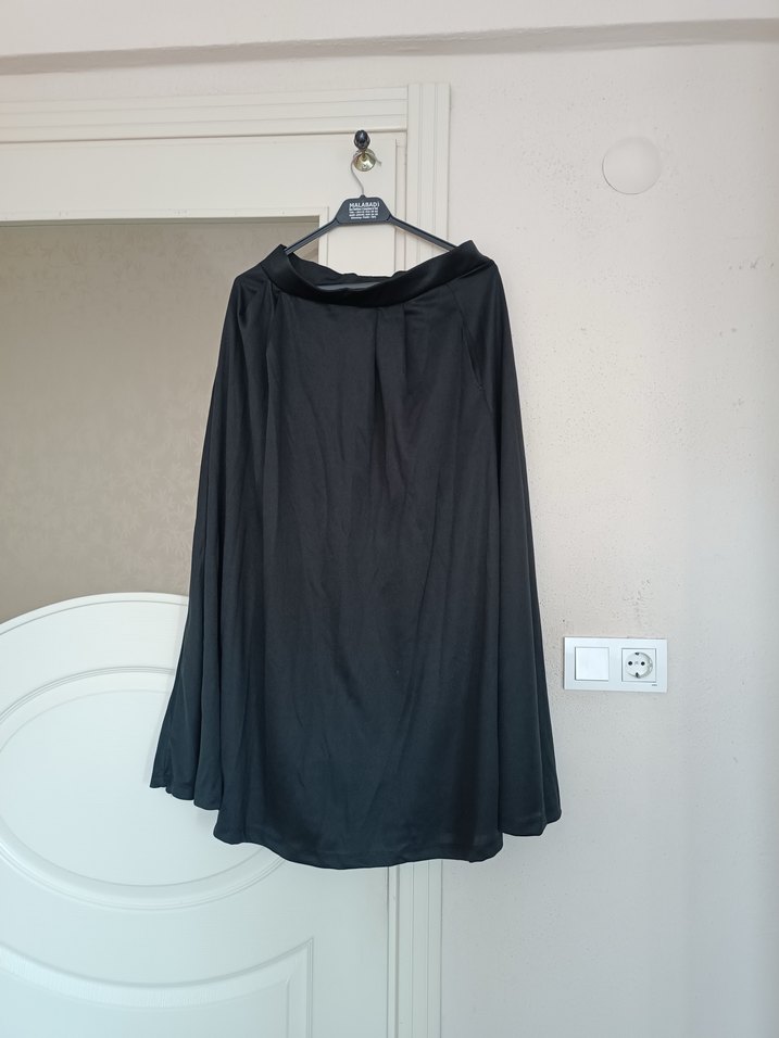 Siyah midi uzunlukta, drapeli ve bol kesim kadın eteği. İpeksi kumaştan yapılmış, gotik tarzda şık ve modern bir parça. Cepleri mevcuttur