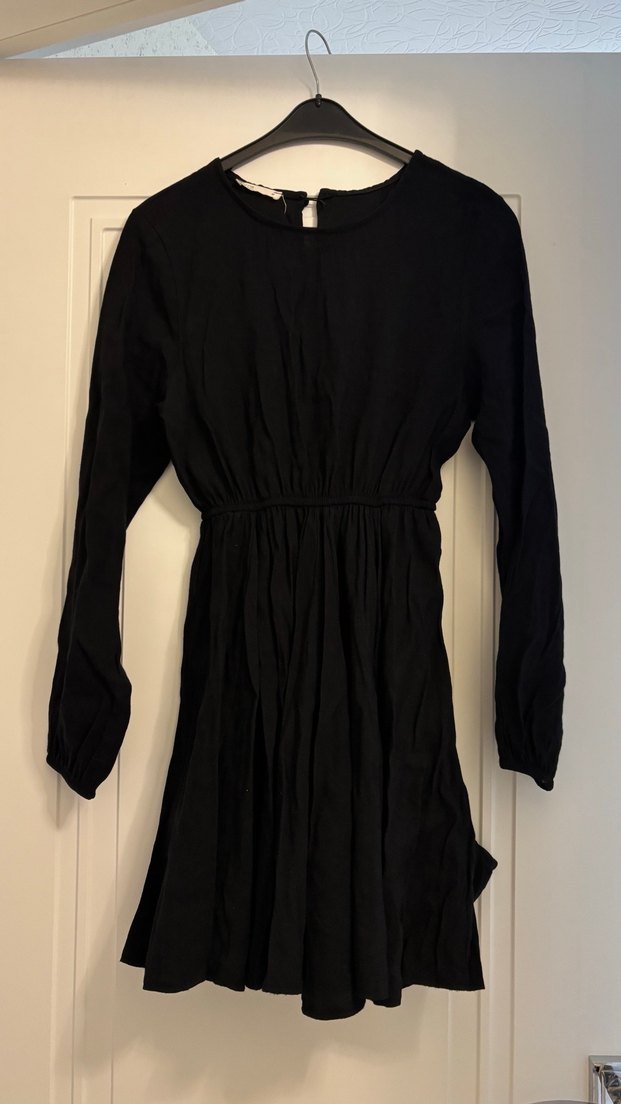 Siyah midi uzun kollu, bol kesim ve drapeli keten kumaştan elbise. V yaka detaylı, gotik ve bohem tarzlar için uygundur.