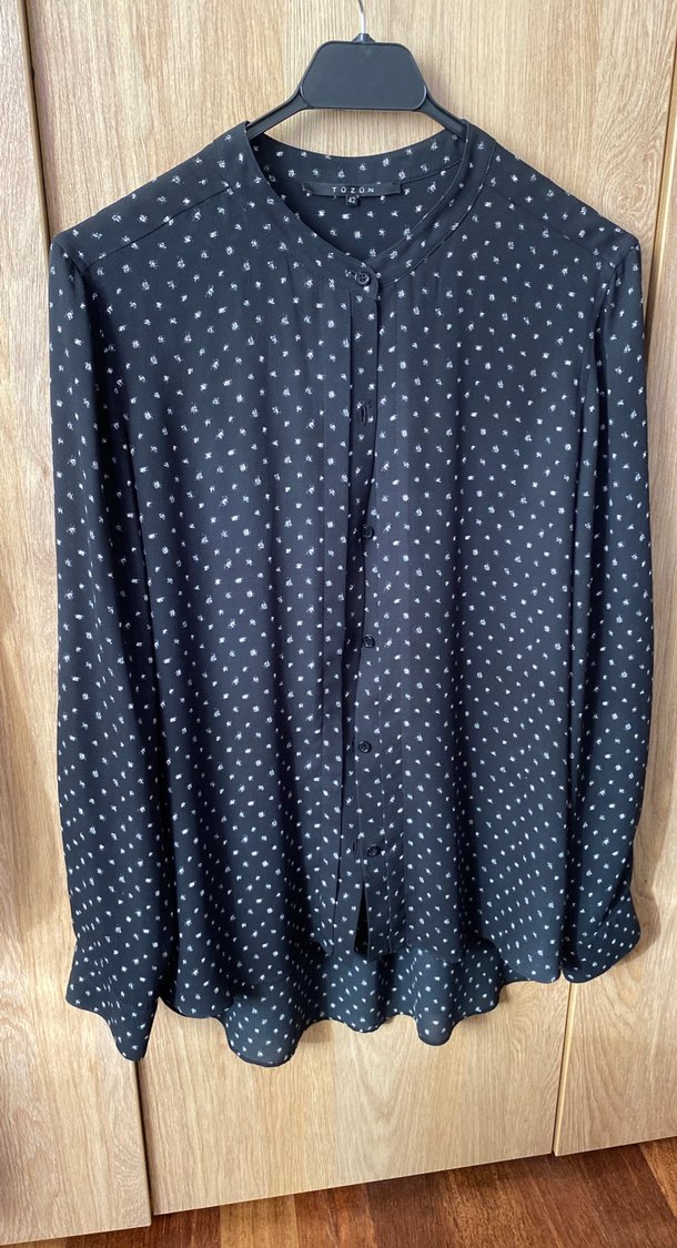 Siyah midi uzunlukta, düğmeli, uzun kollu kadın gömleği. Yuvarlak yakalı, rahat kesim ve hafif desenli, yumuşak sentetik kumaştan. Günlük kullanıma uygun, Paris tarzı. Kol altı. 56 cm Boy. Ön 67. Arka 76 cm