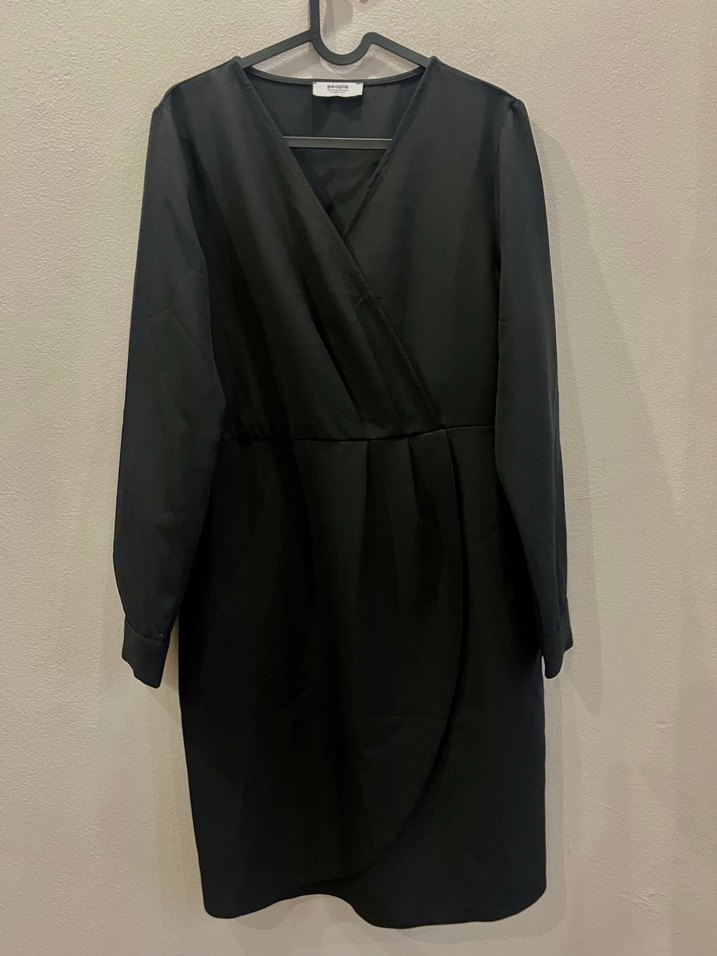 Siyah midi uzun kollu kadın elbise, desensiz minimalist gotik tarzda tasarlanmıştır. Ofis için uygun. Kol altından en 46 cm, boy 94 cm.