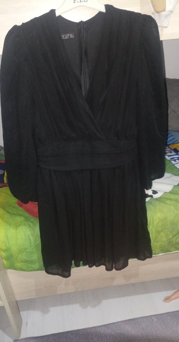Siyah, midi uzunlukta ve uzun kollu, desensiz gotik tarzda bol kesim kadın elbise. Rahat ve koyu renk tonlarında.