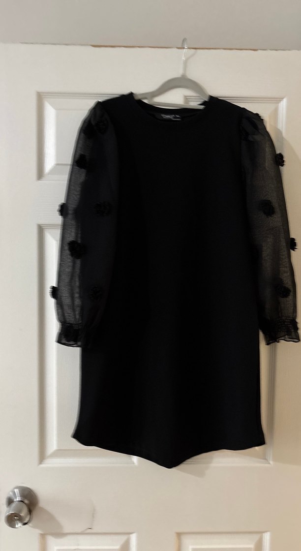 Siyah midi uzun kollu, tüylü detaylı ve bol kesim gotik tarzda kadın elbisesi, yuvarlak yakalıdır.