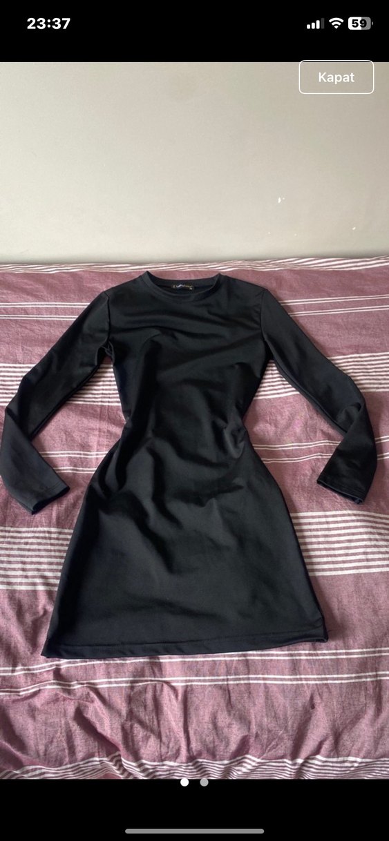 Siyah midi uzun kollu elbise, tek renk ve tek parça, tekne yakalı, rahat sentetik kumaştan günlük kullanım için uygundur.