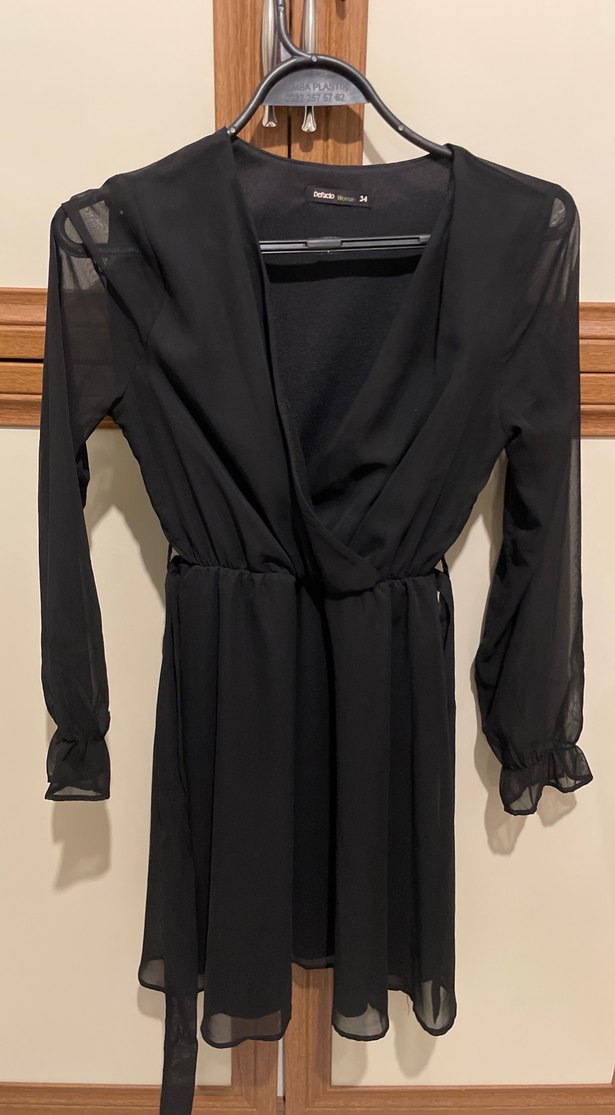 Bu siyah midi elbise, uzun kolları ve hafif volanlı manşetleriyle minimalist goth tarzını yansıtıyor. Derin V yakalı, ince ve hafif kumaştan yapılmıştır.