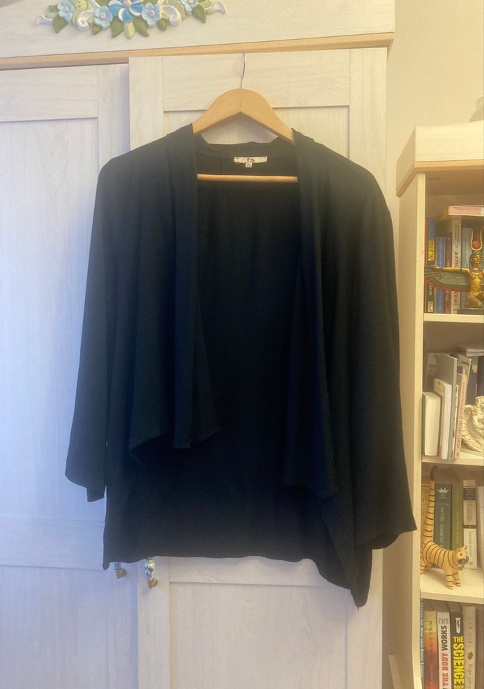 Siyah renkte, ince ve parlak kumaştan yapılmış, midi uzunlukta, uzun kollu, bol kesim ve yakası açık drapeli kadın hırkası.