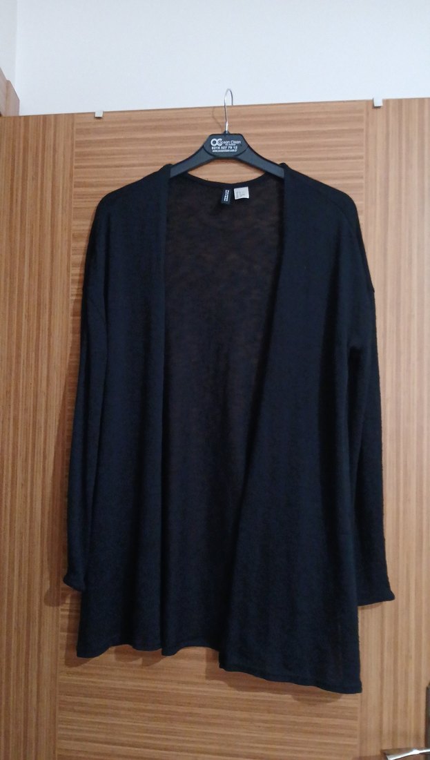 Siyah keten kumaştan, uzun kollu ve yakası açık, dökümlü, rahat kesimli midi uzunlukta minimalist goth tarzı kadın hırka.