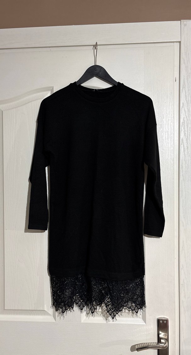 Siyah midi uzun kollu tunik, yuvarlak yaka ve yumuşak sentetik kumaştan yapılmıştır. Bol kesim ve dantelli etek ucu ile rahat goth tarzı sunar. Günlük kullanım için uygundur.