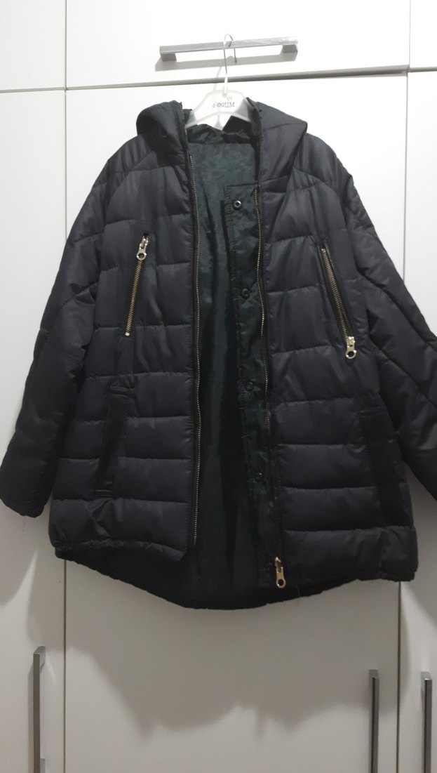 Siyah renkli, fermuarlı ön ve ceplere sahip, rahat kesim ve yumuşak iç astarlı kışlık kadın ceketi. Notlu yaka ve askılı kollara sahiptir.
