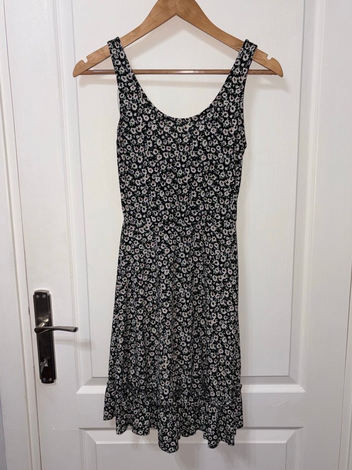 Siyah renkli, bisiklet yaka ve kolsuz, ince dantel detaylı midi boy elbise. Yumuşak sentetik kumaştan, günlük sokak stiline uygun. Ambar markasınındır, S bedendir 2 ya da 3 kez giydim.