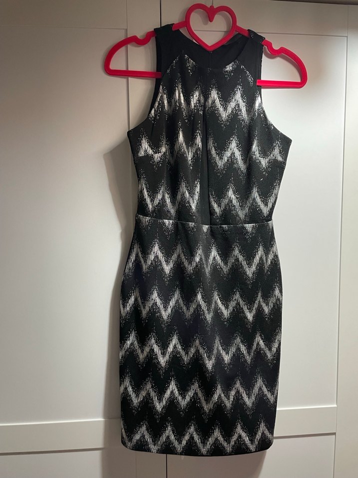 Siyah V yakalı, kolsuz ve vücuda oturan midi elbise. Arkasında fermuar vardır, romantik akşamlar için uygundur.