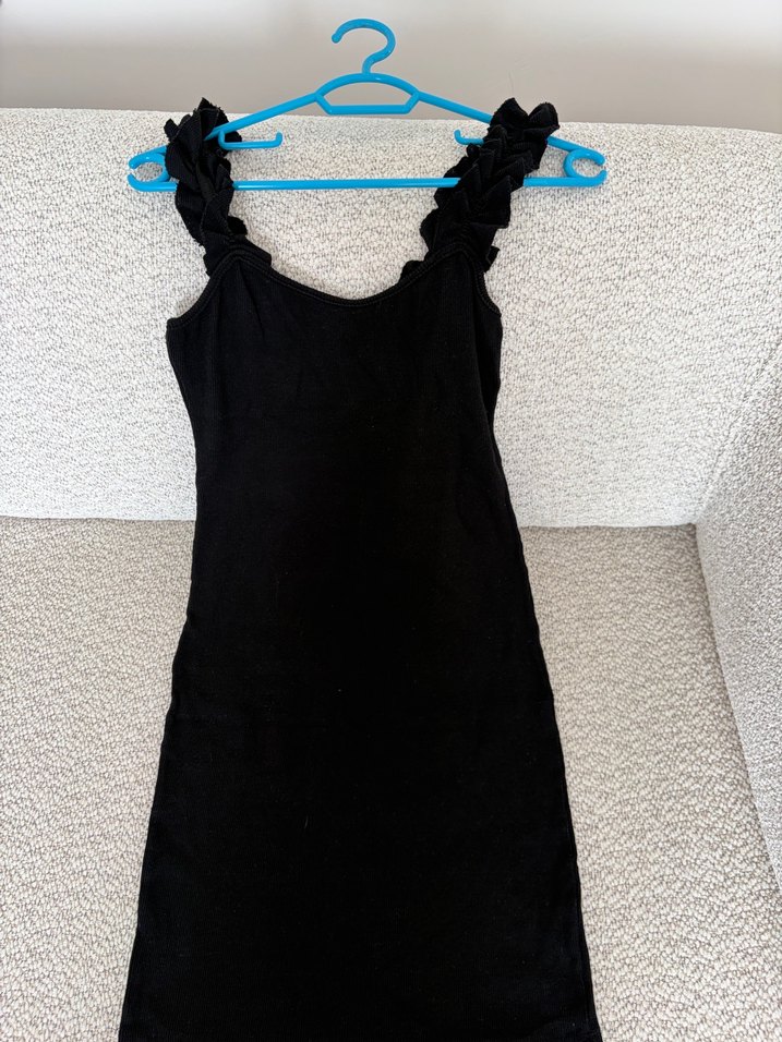 Bu siyah, v yaka ve fırfırlı askılı midi elbise, minimal goth tarzı için uygundur.