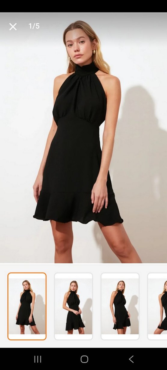 Bu siyah kolsuz midi elbise, V-yaka ve etek ucu fırfırı ile dar kesimdir. İpeksi kumaştan üretilmiş olup, cesur ve minimalist tarzlar için uygundur.