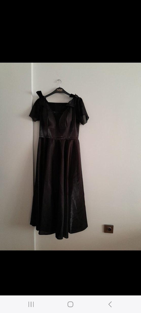 V yaka, drapeli, askılı kollu, siyah midi abiye elbise. Gotik stil ve şık kesimle düğün için uygun. 2 kez giyildi pazarlık payı var.