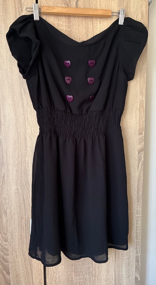 Siyah midi elbise, V yaka, kısa kollu ve düğmeli detaylara sahiptir. Bel kısmı lastikli ve bol kesimdir, yumuşak sentetik kumaştan üretilmiştir.