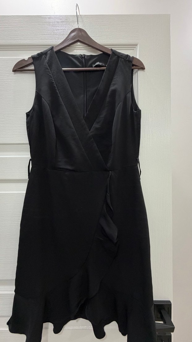 V yaka ve kolsuz siyah midi elbise, klasik ofis şıklığı için uygundur.