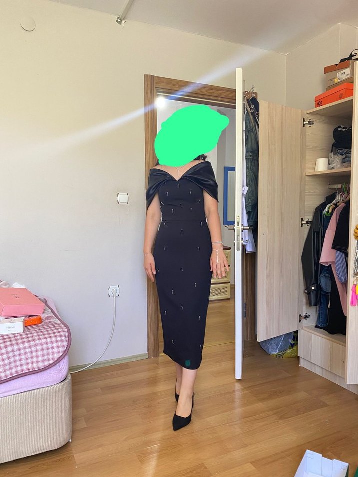 Siyah, midi boy, V yakalı ve kısa kollu, ipeksi kumaştan üretilmiş, ofis için uygun şık ve sade tasarımlı elbise.