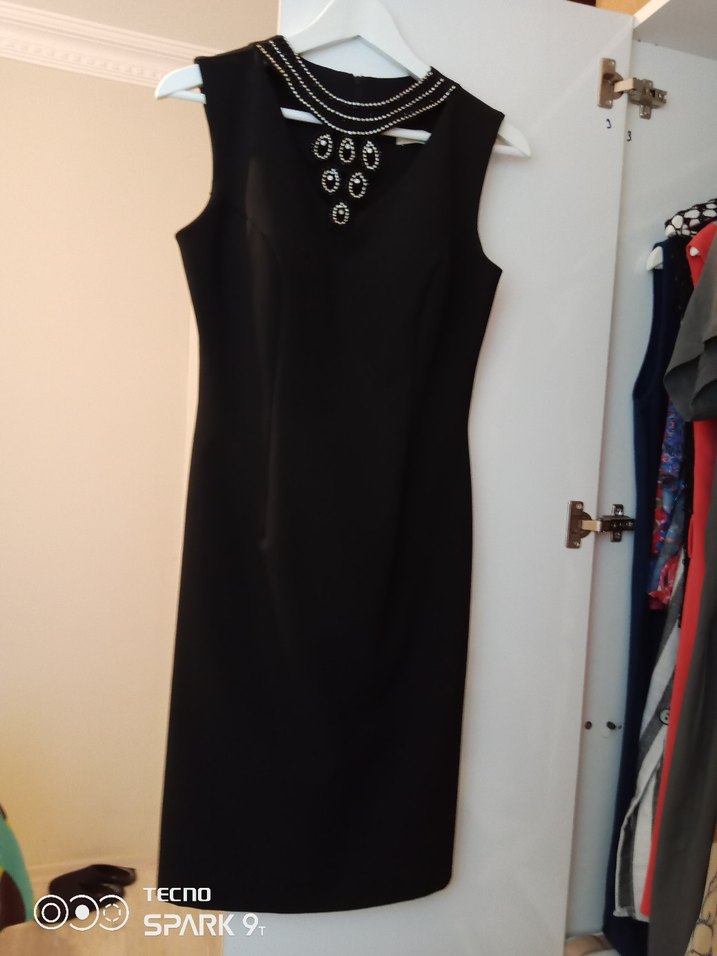 Siyah midi boy, kolsuz, V yaka, tasarıma sahip elbisesi. Minimalist ve goth tarzda, rahat yaka boncuklu abiye bir kez giyildi