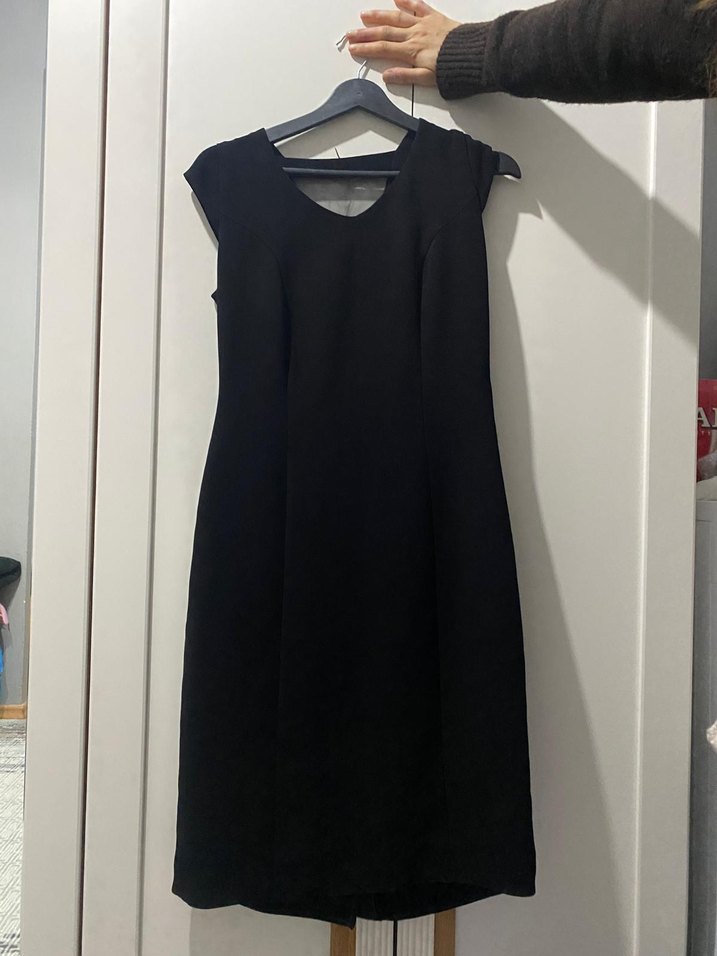 Siyah midi elbise, v yaka ve kolsuz tasarımıyla fit kesime sahiptir. Minimalist gotik tarzıyla ofis için zahmetsiz şıklık sunar.