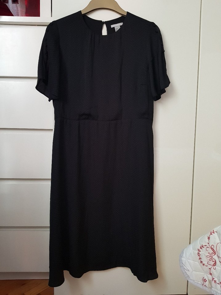 Siyah midi elbise, salaş kesim, drapeli kısa kollu ve V yakalıdır. Minimalist gotik tarzıyla ofis için uygundur. #h&mpuantiyelisiyahelbise #siyahelbise