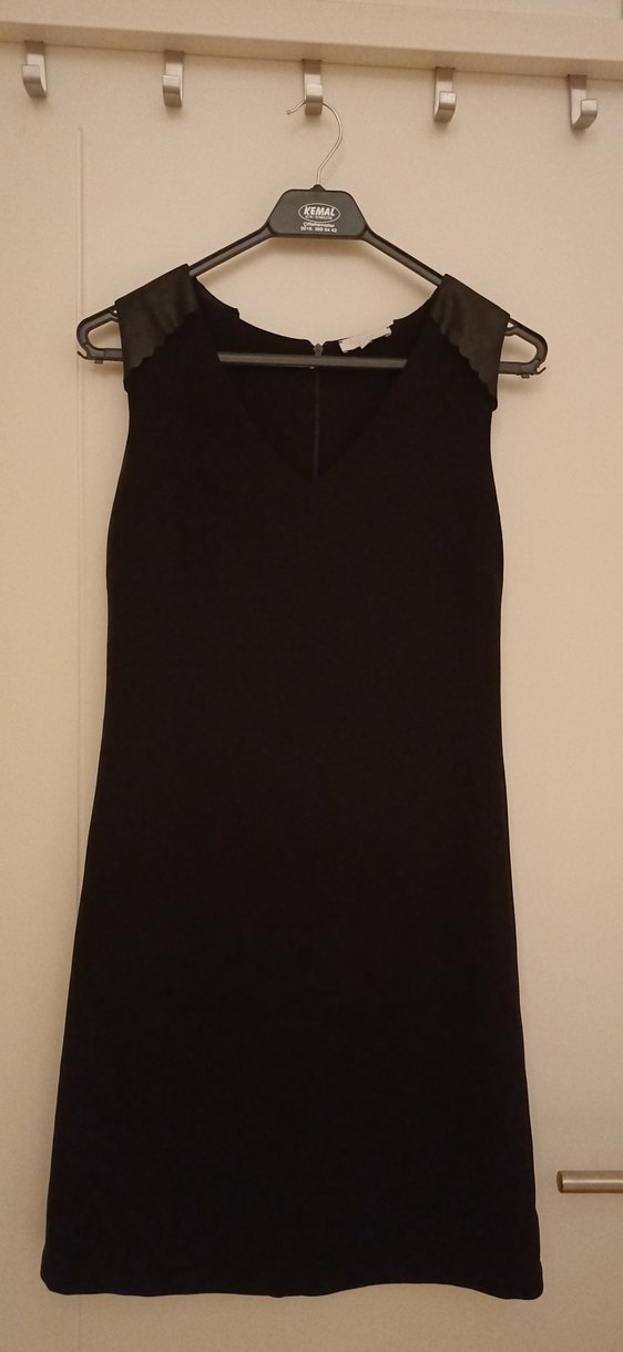 Siyah midi boy, kolsuz, V yakalı ve kollarda deri detaylara sahip, ofis ve gece için uygun, rahat kesim elbise. Omuzlarda deri kumaş var.