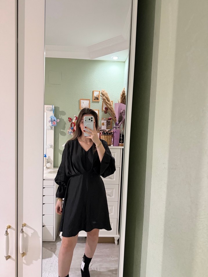 Siyah midi boy, V yakalı, uzun kollu, rahat kesim elbise. İpeksi kumaştan yapılmış, ofis için şık ve kolay kombinlenir.