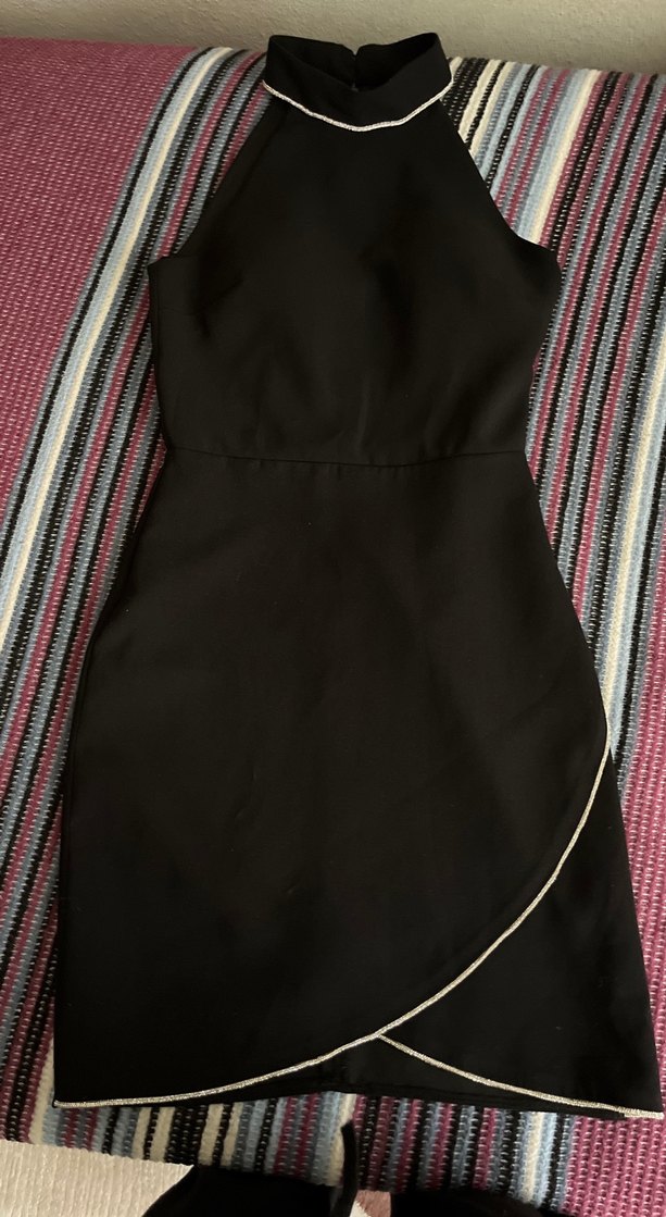 Siyah midi boy, yüksek yakalı ve kolsuz, vücuda oturan bir elbisedir. Fermuarlı sırt detayı ve hafif asimetrik etek ucu bulunur.