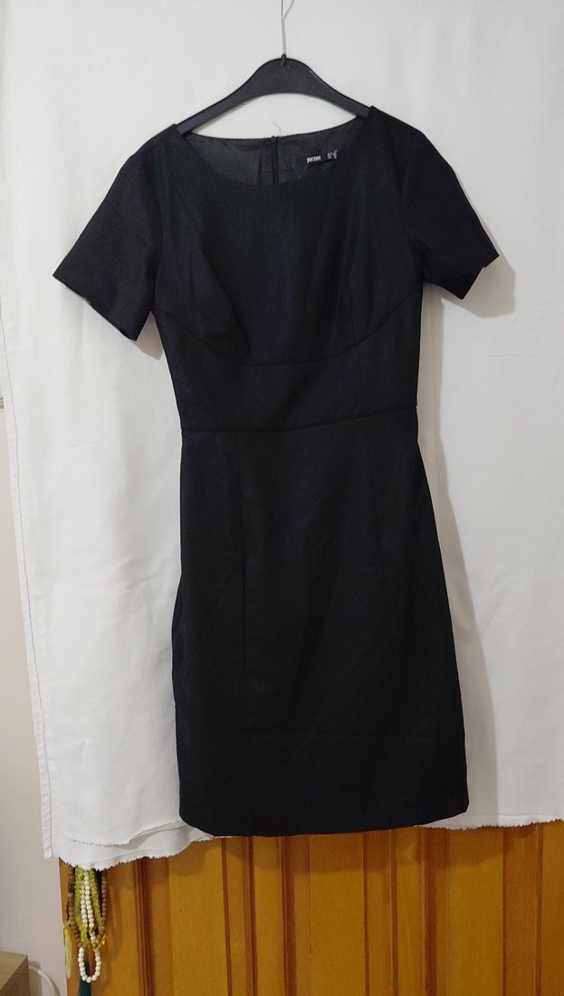 Siyah, kısa kollu, yuvarlak yaka, midi boy ve drapeli detaylara sahip dar kesim elbise. İş ortamları için uygun, gotik ve avant-garde tarzda. uzunluk96cm beden genişlik kol altından arkalı önlü 90cm astarlı( kumaşı esnek deği)