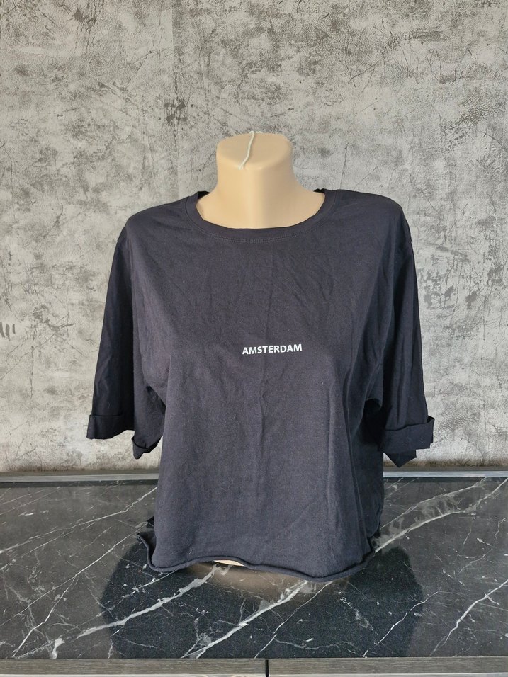 Siyah renkli, kısa kesim ve bol kesim denim kumaştan yapılmış kadın tişörtü. Önünde 'AMSTERDAM' baskısı bulunur, rahat ve şık bir sokak stili sunar.