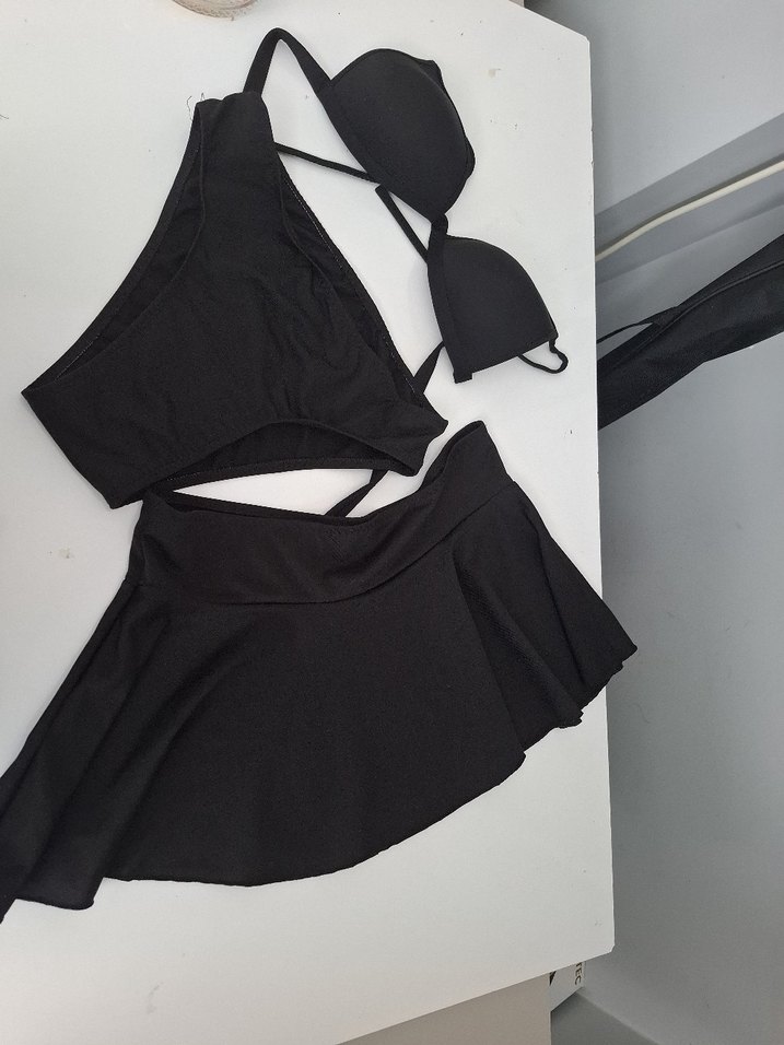 Siyah, askılı ve vücuda oturan üst ile yüksek bel alt parçaya sahip mayo takımı; drapeli mini etekle tamamlanmıştır.