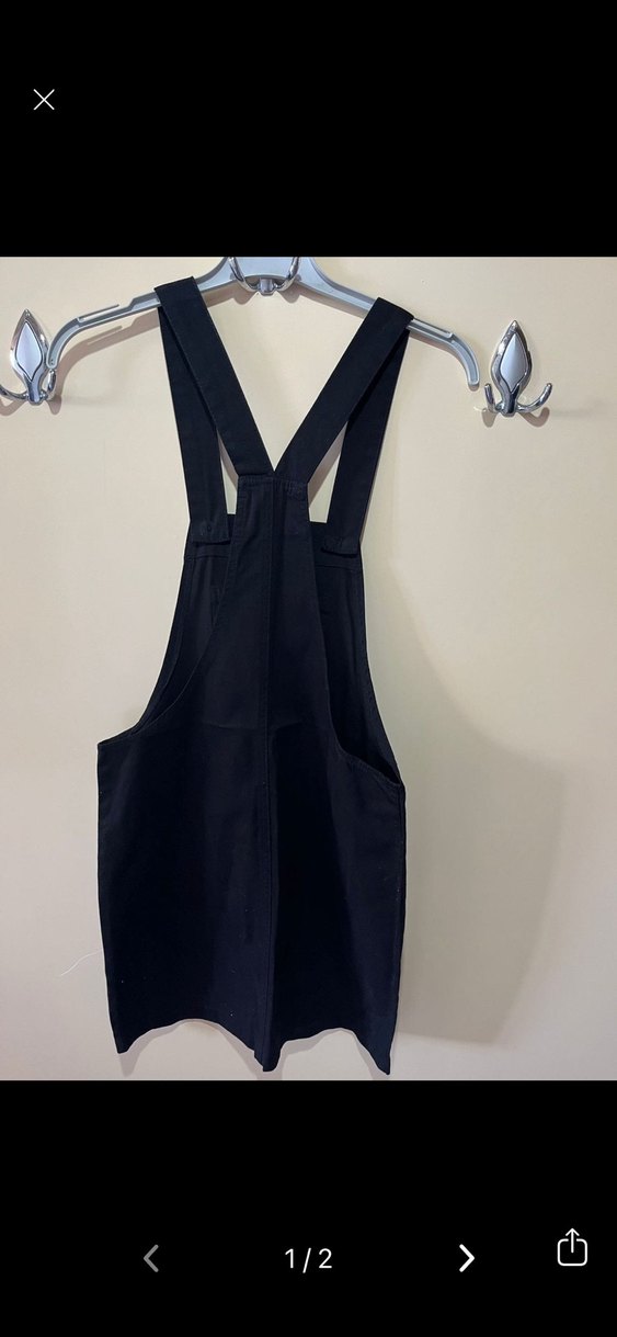 Siyah mini, askılı ve yüksek yakalı tulum. Kemerli detayları ve düzgün sentetik kumaşı ile trend günlük tarz için uygundur.