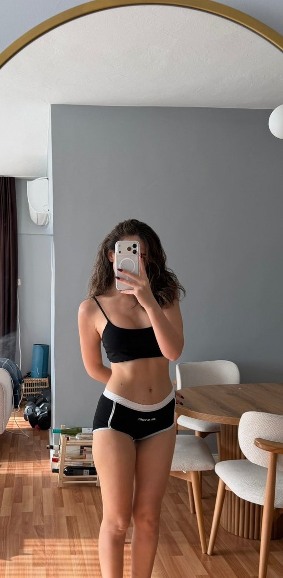 İnce askılı siyah mini atlet ve beyaz detaylı siyah şorttan oluşan rahat ve sade takım.