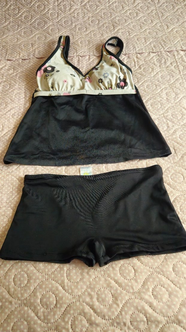 Çiçek desenli askısız üst ve siyah şortlardan oluşan, vücuda oturan siyah kadın mayosu, streetwear ve athleisure tarzını birleştiriyor. ️