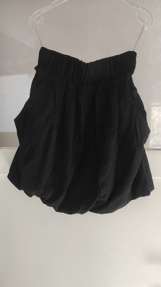 Siyah, drapeli ve bol kesim, balon mini etek. Gotik tarzda, romantik akşamlar için uygun. Ürün az kullanılmıştır. Etiketinde 2 beden yazmaktadır fakat beli lastikli olduğu için S-M bedenler için uygundur. Belinde kemer için geçişler vardır. Yanlarda 2 küçük cep bulunur. İçi astarlıdır. %65 Polyester, %33 Wiscon, %2 Elastan kumaştır. Ölçüleri; belden boyu 48 cm, beli 34 cm, etek genişliği 52,5 cm'dir.