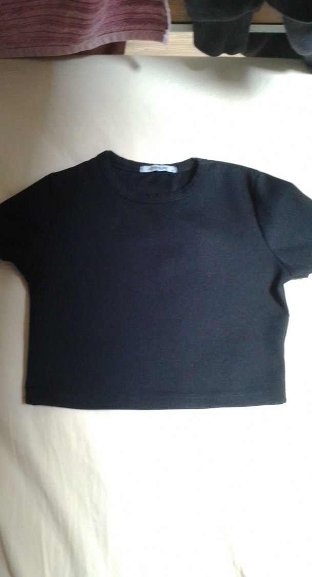 Siyah mini basic tişört, yuvarlak yaka ve kısa kollu. Düz, sentetik kumaştan, günlük sokak stiline uygun minimal tasarım.