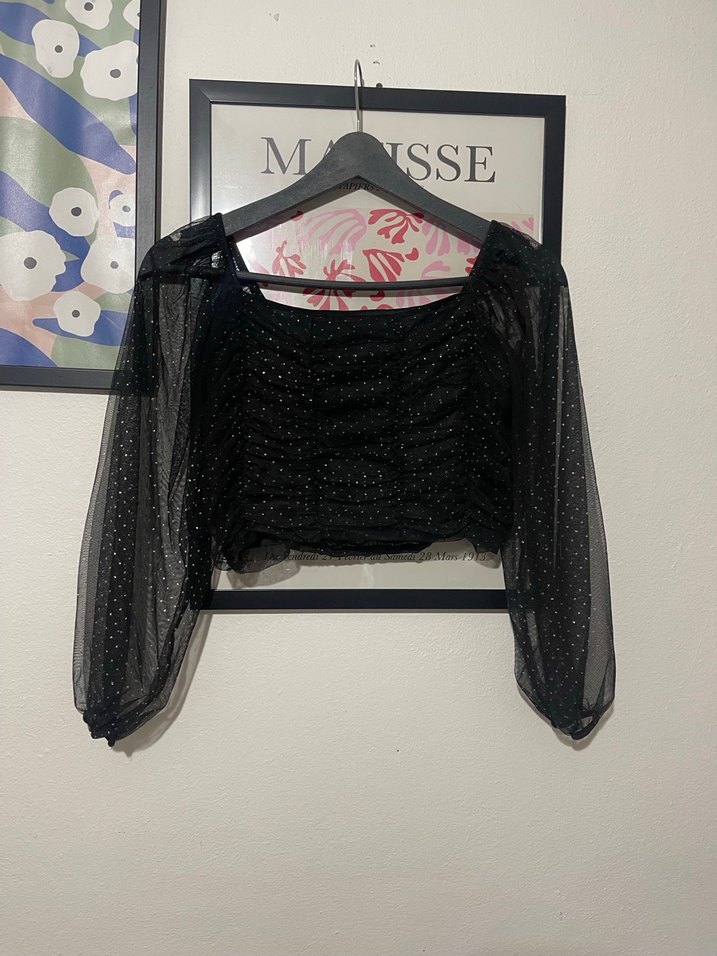 Uzun tül kolları ve dantel detayları olan siyah mini bluz, bol kesim ve desenli yapısıyla günlük sokak modasına uygun. S m uyumludur