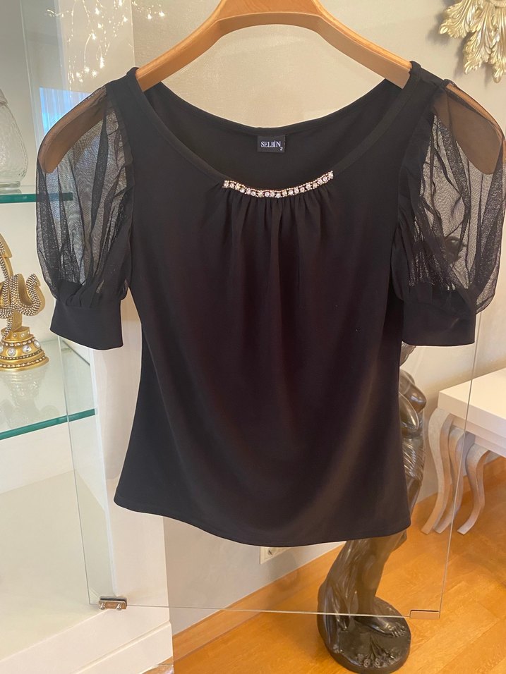 Siyah, kısa kollu, taş detaylı ve şeffaf balon kollu, rahat kesimli mini bluz. İpeksi dokusu günlük kullanıma uygundur.