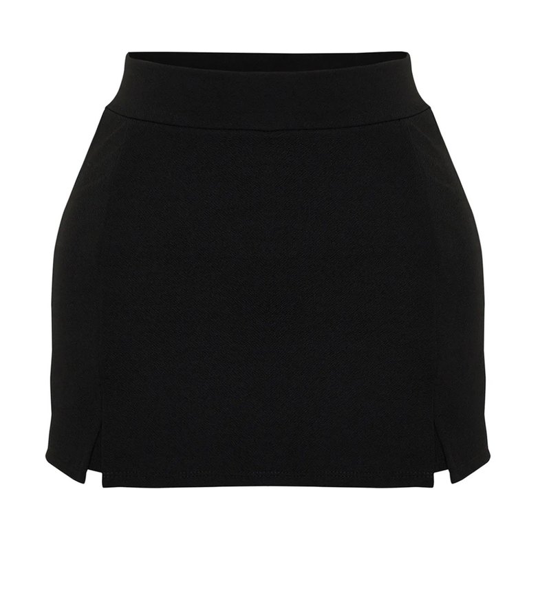 Siyah mini etek, dar kesim ve kısa boyda, yumuşak sentetik kumaştan üretilmiştir. Gotik athleisure tarzıyla romantik akşamlar için uygundur.