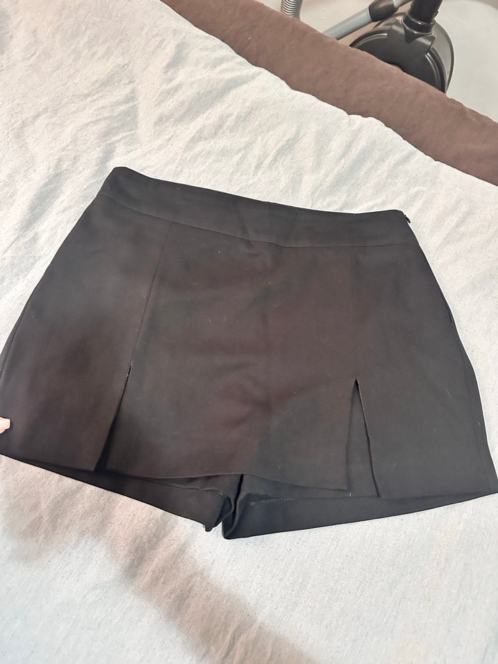 Siyah, dar kesim mini etek, düz sentetik kumaştan, önünde ince yırtmaçlarla sade ve şık bir sokak stili sunar.