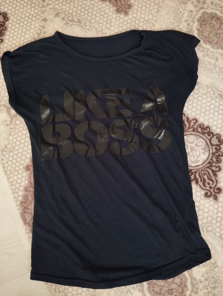 Siyah kısa kollu denim tişört, bol kesim ve 'LIKE A BOSS' baskılı. Yuvarlak yakalı ve mini boy, günlük sokak tarzı için uygun.