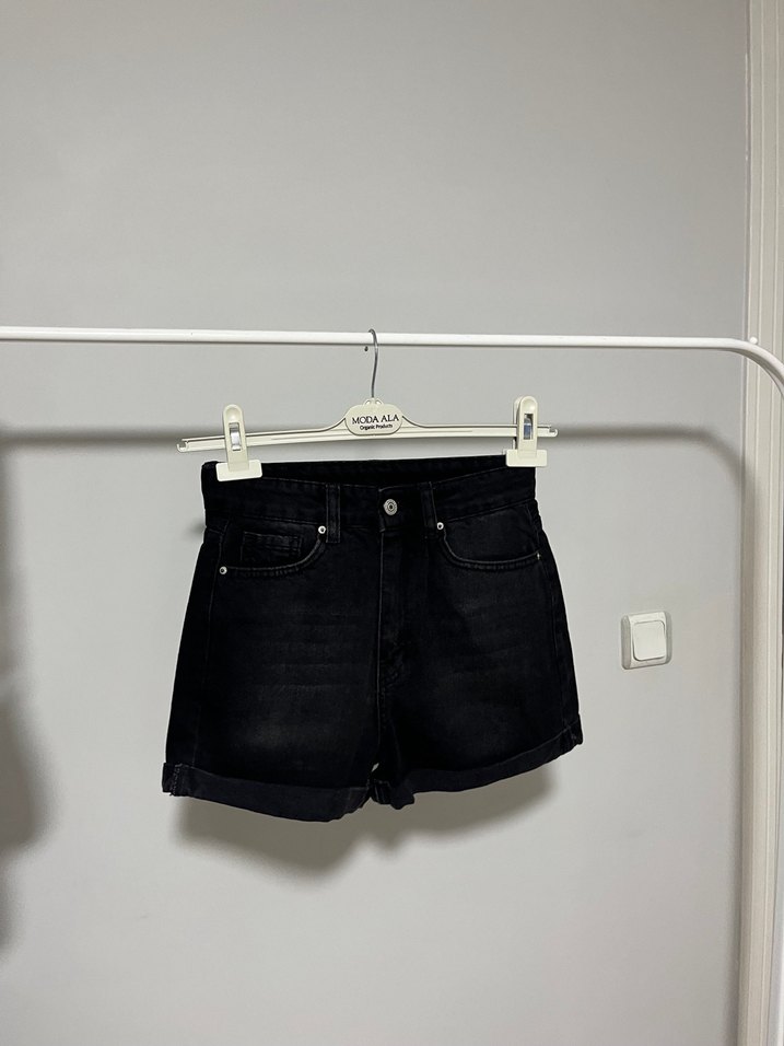 Siyah renkli, kısa kesim olan bu fitted denim şort, günlük sokak stili için uygundur.