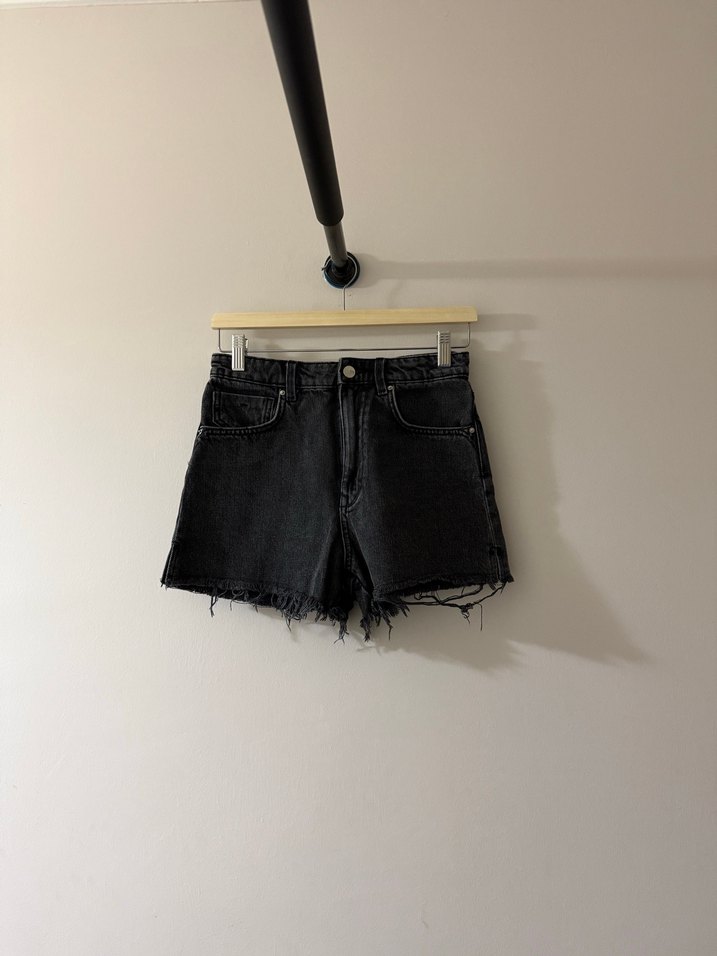 Kısa kesim, rahat oturan siyah denim şort. Püsküllü alt kısmı ve desen içermeyen tasarımıyla günlük kullanıma uygun, zahmetsiz şıklık sunar.