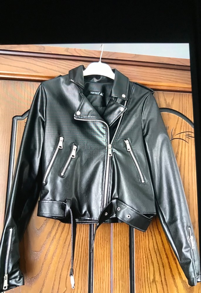Siyah mini deri biker ceket, çıtçıtlı yakası, fermuarlı detayları ve askılı kollarıyla grunge punk tarzını yansıtıyor. Günlük kullanıma uygundur. Sıfır ürün hiç kullanılmadı