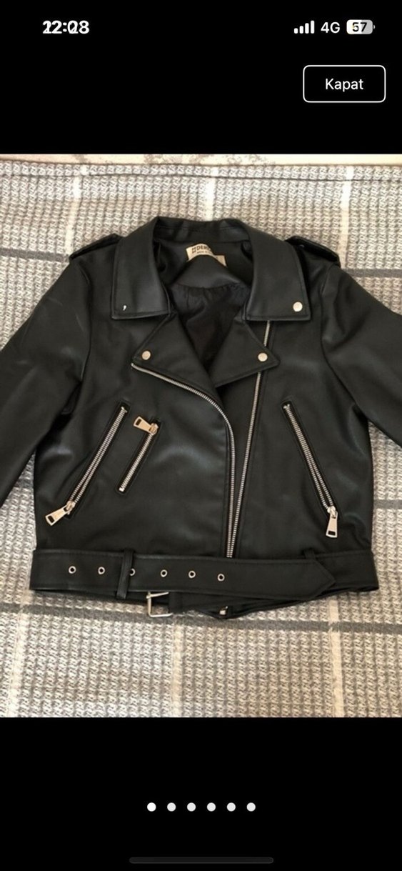 Kemerli ve kayışlı kollu, siyah mini deri biker ceket. Çentikli yaka ve dar kesim ile günlük kullanıma uygun.
