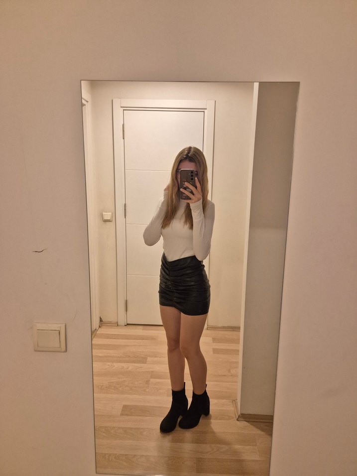 Siyah mini deri etek,önü v şeklinde duruyor büzgülü çok güzel bana beli bol geldiği için satıyorum yaptırsam kötü duracak deri olduğu için ve uğraşmak istemedim hiç bir sıkıntısı defosu yok fermuarı da kapanıyor sorunsuz