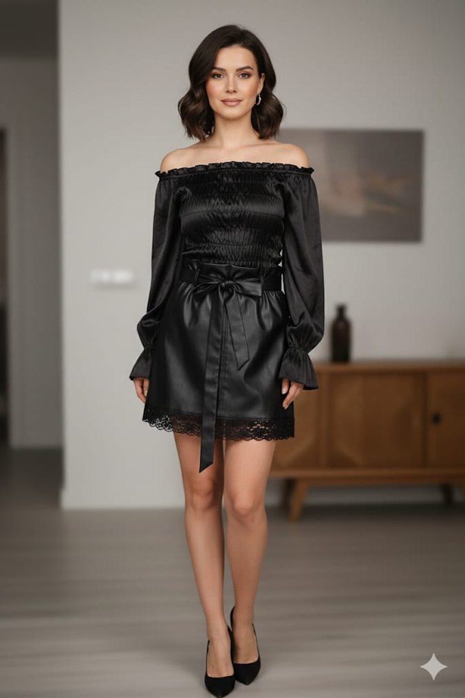 Siyah Mini Deri etek straplez saten bluz